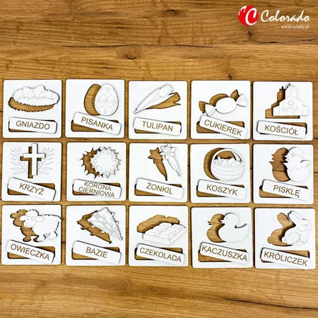 UKŁADANKA TEMATYCZNA – ŚWIĘTA WIELKANOCNE Produkt edukacyjny do nauki języka polskiego.Wykonany z płyty HDF; grawerowany laserowo.Zawiera 45 elementów (15 tabliczek z wyciętymi kształtami, 15 kształtów, 15 nazw kształtów).Zastosowanie:– nauka słownictwa,– stymulacja rozwoju mózgu,– nauka logicznego myślenia,– ćwiczenie chwytności i precyzyjności ruchów,– ćwiczenie koncentracji i widzenia przestrzennego,– rozpoznawanie i dopasowywanie kształtów,– ćwiczenie pamięci,– rozwój myślenia przyczynowo-skutkowego,Potrzebujesz pomocy? Masz pytania?Zadaj pytanie a my odpowiemy niezwłocznie, najciekawsze pytania i odpowiedzi publikując dla innych.