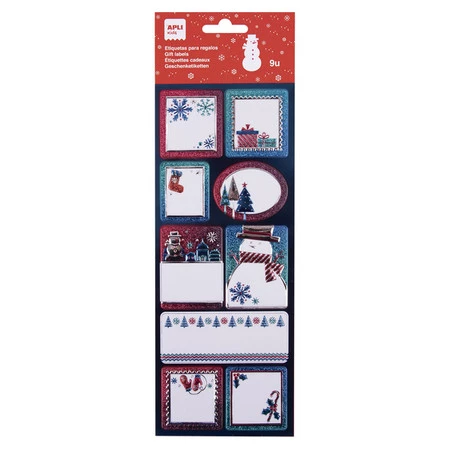 Etykiety samoprzylepne na prezenty o tematyce świątecznej. Opakowanie zawiera 1 arkusz z 9 naklejkami w różnych rozmiarach oraz z brokatowym wykończeniem. Wysokiej jakości trwałe etykiety samoprzylepne idealnie sprawdzą się do oznaczania i identyfikacji prezentów, pisania dedykacji itp.
