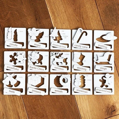 UKŁADANKA TEMATYCZNA – CHRISTMAS Produkt edukacyjny do nauki języka angielskiego.Wykonany z płyty HDF; grawerowany laserowo.Zawiera 45 elementów (15 tabliczek z wyciętymi kształtami, 15 kształtów, 15 nazw kształtów).Zastosowanie:– nauka słownictwa,– stymulacja rozwoju mózgu,– nauka logicznego myślenia,– ćwiczenie chwytności i precyzyjności ruchów,– ćwiczenie koncentracji i widzenia przestrzennego,– rozpoznawanie i dopasowywanie kształtów,– ćwiczenie pamięci,– rozwój myślenia przyczynowo-skutkowego,Potrzebujesz pomocy? Masz pytania?Zadaj pytanie a my odpowiemy niezwłocznie, najciekawsze pytania i odpowiedzi publikując dla innych.