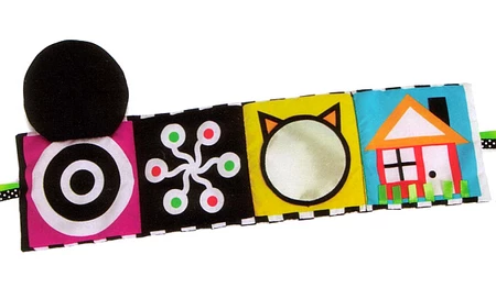 Miękka, materiałowa książeczka dla malucha z serii Wimmer-Ferguson marki Manhattan Toy, wykonana z przyjemnego w dotyku materiału zachęca dzieci do poznawania nowych kształtów, barw i dźwięków. Książeczka zawiera także: szeleszczące części, lusterko, wstążki, klapy wykonane z materiału pod którymi znajdują się ciekawe kształty.