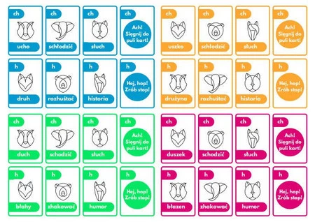 - karty z wyrazami z "h" po "z" (rozhuśtać, zhakować),