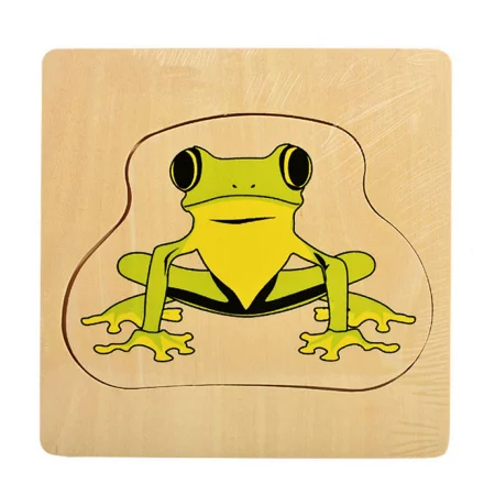 Puzzle warstwowe przedstawiające rozwój żaby składają się z 4 elementów reprezentujących kolejne fazy cyklu życia tego płaza: skrzek, kijanka, mała żabka z ogonem, dorosła żaba oraz podstawy z wyżłobieniami, na której układamy puzzle w odpowiedniej kolejności.
