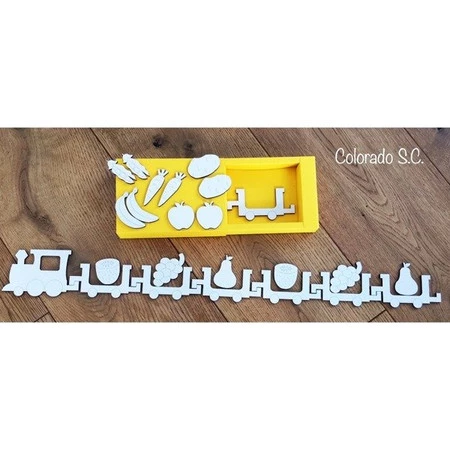 - POCIĄG SEKWENCYJNY – OWOCE I WARZYWAIlość elementów : 23 sztuki (pociąg, 6 wagoników, 10 owoców w tym 2 banany, 2 jabłka, 2 gruszki, 2 kiwi, 2 winogrona oraz 6 warzyw w tym 2 groszki, 2 ziemniaki, 2 marchewki)Wymiary wnętrza pudełka : 12,5x 10cmMateriał,