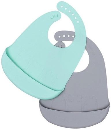 - Zestaw śliniaków silikonowych z kieszonką marki We Might Be Tiny w kolorach Mint i Grey zminimalizuje bałagan podczas posiłków.
