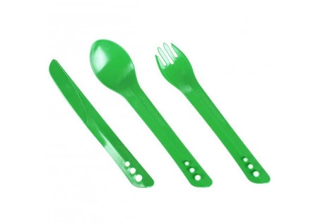 Zestaw sztućców Lifeventure składający się z łyżki, noża i widelca. Sztućce wykonane są z lekkiego, bardzo wytrzymałego plastiku bez BPA. Zajmują bardzo mało miejsca, ponieważ można je ze sobą złączyć.