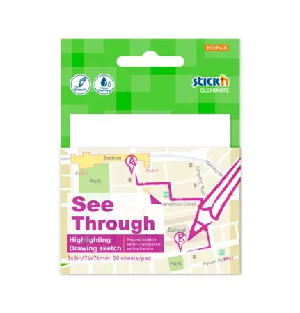 Przezroczysty, bezbarwny notes samoprzylepny zawierający 50 karteczek o wielkości 76 × 76 mm.