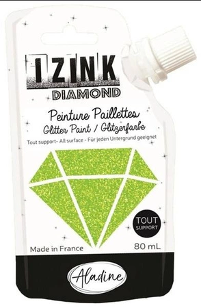 Limonkowa farba brokatowa. Nadaje się do użycia na każdym rodzaju powierzchni, takich jak drewno, beton, papier, tkaniny, plastik, metal itp. Efekt dekoracyjny jest bardzo wyrazisty dzięki koncentracji brokatu i transparentnej bazie farby. Idealna do spersonalizowania ozdób mieszkania lub ubrań. Można nią malować pędzlem lub nakładać przez szablon. Tubka z miękkiego tworzywa sztucznego nadaje się do recyklingu i pozwala na wykorzystanie farby do ostatniej kropli. Przy ozdabianiu tkanin należy zostawić farbę do wyschnięcia, a następnie utrwalić ją termicznie żelazkiem (ustawionym na temperaturę dostosowaną do rodzaju tkaniny) prasując po lewej stronie (albo przez papier do pieczenia lub cienką ściereczkę) przez 5 minut bez użycia pary. Na butach z tkaniny farbę utrwalić można suszarką do włosów ustawioną na wysoką temperaturę. Po utrwaleniu tkaniny można prać w temperaturze 40 °C. Nieodpowiednie dla dzieci w wieku poniżej 36 miesięcy. Pojemność 80 ml. Made in France.Farby