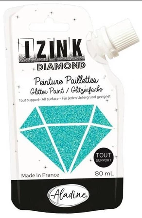 Turkusowa farba brokatowa. Nadaje się do użycia na każdym rodzaju powierzchni, takich jak drewno, beton, papier, tkaniny, plastik, metal itp. Efekt dekoracyjny jest bardzo wyrazisty dzięki koncentracji brokatu i transparentnej bazie farby. Idealna do spersonalizowania ozdób mieszkania lub ubrań. Można nią malować pędzlem lub nakładać przez szablon. Tubka z miękkiego tworzywa sztucznego nadaje się do recyklingu i pozwala na wykorzystanie farby do ostatniej kropli. Przy ozdabianiu tkanin należy zostawić farbę do wyschnięcia, a następnie utrwalić ją termicznie żelazkiem (ustawionym na temperaturę dostosowaną do rodzaju tkaniny) prasując po lewej stronie (albo przez papier do pieczenia lub cienką ściereczkę) przez 5 minut bez użycia pary. Na butach z tkaniny farbę utrwalić można suszarką do włosów ustawioną na wysoką temperaturę. Po utrwaleniu tkaniny można prać w temperaturze 40 °C. Nieodpowiednie dla dzieci w wieku poniżej 36 miesięcy. Pojemność 80 ml. Made in France.Farby