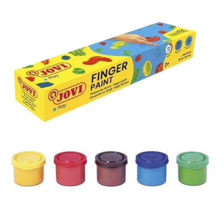 Farby do malowania palcami marki JOVI - opakowanie zawiera 5 pojemników farb po 35 ml w różnych kolorach: czerwonym, zielonym, zółtym, niebieskim i brązowym.