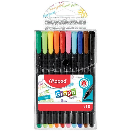 Cienkopis Graph’Peps. Uniwersalna linia cienkopisów dla każdego, do użycia w szkole, w domu i w biurze. Końcówka oprawiona w metal. Grubość końcówki 0,4mm. Bezpieczna, wentylowana skuwka z klipsem. Ergonomiczny, trójkątny kształt poprawia komfort pisania. Etui 10 kolorów. Js 1 etui.Podmiot odpowiedzialny za ten produkt na terenie UE