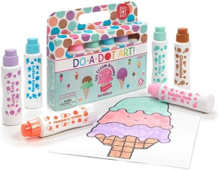 Flamastry Kropkowe to produkt, który rozwija wiele umiejętności u dzieci. Przede wszystkim, korzystanie z nich stymuluje rozwój motoryki małej, co jest niezwykle istotne w procesie nauki pisania. Dzieci mogą eksperymentować z kolorami, tworzyć własne projekty i wyrażać siebie poprzez sztukę, co wpływa na rozwój ich kreatywności.Cechy Dużych Flamastrów Kropkowych Pachnących. Słodkie Lody marki Do-A-Dot Art