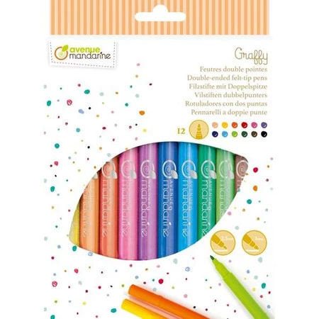 12 flamastrów dwustronnych w kolorach: brzoskwiniowym, żółtym, pomarańczowym, czerwonym, różowym, fioletowym, ciemnoniebieskim, jasnoniebieskim, jasnozielonym, ciemnozielonym, brązowym i czarnym.