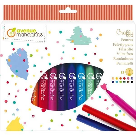 12 flamastrów o filcowych końcówkach, w kolorach: brzoskwiniowym, żółtym, pomarańczowym, czerwonym, różowym, fioletowym, ciemnoniebieskim, jasnoniebieskim, jasnozielonym, ciemnozielonym, brązowym i czarnym.
