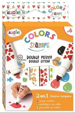 Zestaw 6 stempelków-markerów 2 w 1. 2 końcówki pozwalają dzieciom stemplować i malować markerami. Stempelki w atrakcyjnych dla dzieci kształtach. Bardzo łatwe w użyciu, wystarczy tylko zdjąć skuwkę i przyłożyć wzorem do kartki. Nie ma potrzeby maczania stempelka w poduszce z tuszem, gdyż wkład wewnątrz rączki jest już nasączony. Każdy stempelek w jednym z 6 kolorów (zielony, pomarańczowy, czerwony, niebieski, brązowy i czarny). Polecane od szóstego roku życia. Nieodpowiednie dla dzieci w wieku poniżej 36 miesięcy. Wymiary wzorów około 9 mm. Made in Italy.Potrzebujesz pomocy? Masz pytania?Zadaj pytanie a my odpowiemy niezwłocznie, najciekawsze pytania i odpowiedzi publikując dla innych.