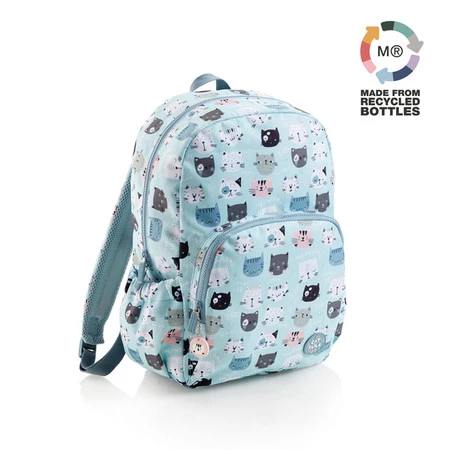 Dwukomorowy plecak Roma marki Miquelrius z wesołą grafiką przedstawiającą kotki. Posiada jedną komorę główną oraz boczną kieszeń, obie zapinane na suwak. Plecak wykonany został z poliestru z recyklingu RPET. Ma wysokiej jakości wytrzymałe zamki, z metalowymi uchwytami i taśmą ułatwiającą otwieranie. Ergonomiczne i regulowane pasy naramienne z wypełnieniem zwiększają komfort użytkowania. W przedniej komorze jest dodatkowa kieszonka zapinana na zamek, która ułatwi organizację drobiazgów a boczne kieszenie na butelkę umożliwią szybki dostęp do napoju.