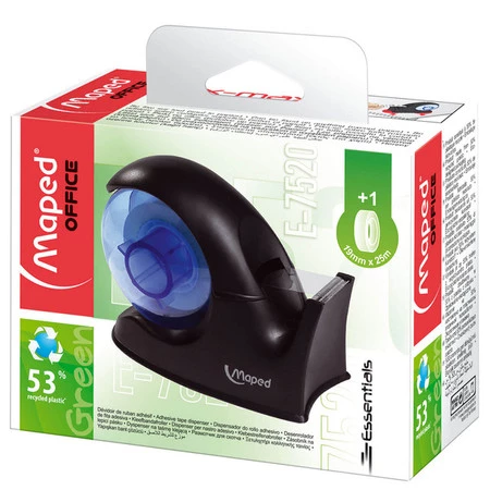 Dyspenser na biurko do taśmy klejącej o wymiarach 19 mmx 33 m. Wykonany z wysokiej jakości tworzywa sztucznego. Możliwość przyklejenia do biurka, w zestawie z 1 rolką taśmy, dostępny w kolorze czarnym z elementami niebieskimi. Jednostka sprzedaży 1 sztuka pudełko z zawieszką.Podmiot odpowiedzialny za ten produkt na terenie UE