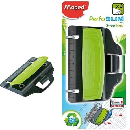 Dziurkacz ekologiczny SLIM do 3 kartek. Umożliwia dziurkowanie i wpinanie na bieżąco kartek do segregatora. Przystosowany do wpięcia w ringi segregatora, przez co ułatwia centrowanie strony. Wyposażony w podziałkę cm, uchwyt na długopis oraz pojemnik na konfetti. W 72 % wykonany z surowców wtórnych. Blister. JS 1 szt.Podmiot odpowiedzialny za ten produkt na terenie UE
