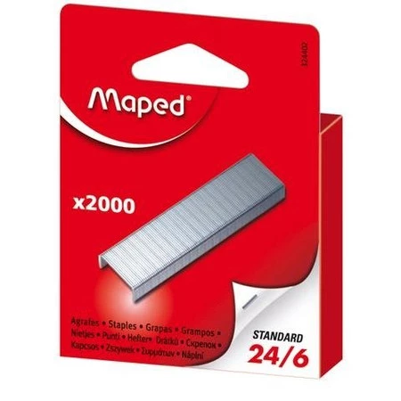 Zszywki Maped 24/6 2000 szt pudełko z zawieszką. Zszywki wykonane z wysokiej jakości galwanizowanej stali. Charakteryzują się duża twardością i odpornością na rozciąganie.Zaostrzone końce zapobiegają zginaniu i łatwo przebijają zszywany plik. JS 1 pudełko.