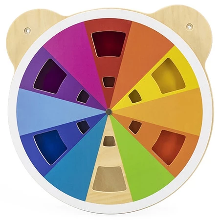 Jedna z serii drewnianych tablic z uroczą głową misia. Tablica z akrylową tarczą na przodzie w różnych odcieniach. Dziecko dzięki obracaniu tarczy tablicy może mieszać kolory w dowolny sposób i odkrywać jakie inne barwy powstają. W sumie można uzyskać 60 różnych kolorów. Produkt idealnie sprawdzi się zarówno w domowym zaciszu, jak i w placówkach oświatowych, wczesnoszkolnych. Ciekawe przygotowanie formy tablicy z pewnością przykuje uwagę każdego malucha. Całość wykonana została z drewna lakierowanego i pomalowana nietoksycznymi farbami w żywe barwy, które zadowolą każdego użytkownika i dadzą mnóstwo radości z zabawy. Produkt przeznaczony dla dzieci od 18 miesiąca życia. W naszej ofercie dostępna jest cała seria tablic z głową misia.