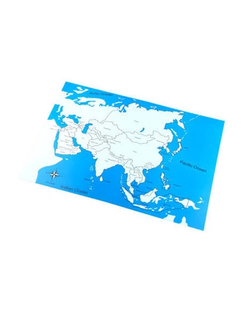 - Pomoc Montessori - Mapa kontrolna z podpisami przedstawiająca kontynent Azja ma wymiary 57 x 43 x 0,5 cm.