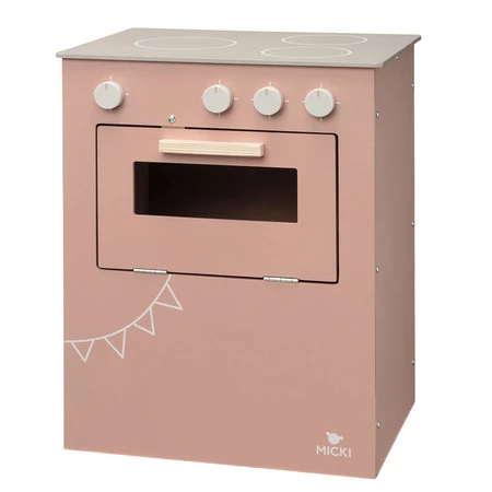 - Klasyczna drewniana kuchnia do zabawy Micki. Kuchenka ma trzy palniki, piekarnik z otwieranymi drzwiczkami i cztery pokrętła z dźwiękami kliknięć.