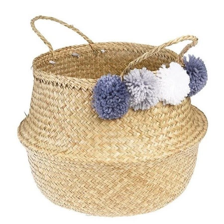 Ten rozkładany ręcznie tkany kosz z bawełny i trawy morskiej jest ozdobiony pomponami w gustownym kolorze neutralnej szarości. Można go używać na dwa sposoby - z uchwytami obróconymi do góry, dla maksymalnego zwiększenia pojemności, lub do dołu, aby lepiej wyeksponować zawartość.