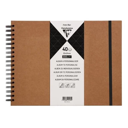 Brązowa twarda okładka z czarną gumką, 40 naturalnych brązowych kartek o gramaturze 200 g/m^2, o wymiarach 32x24 cm.