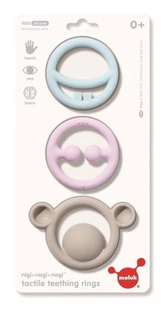Poznaj Nigi, Nagi & Nogi! To zestaw 3 designerskich gryzaków, które ukoją ból dziąseł w okresie ząbkowania. Wykonane w 100% z silikonu spożywczego bezpiecznego dla najmłodszych. Pierścienie są łatwe do chwycenia przez małe rączki. Dzięki niebanalnym kształtom i żywym kolorom zapewnią stymulację dotykową i wizualną. Niebieski gryzaczek posiada w środku wypustkę, którą można wciskać oraz 2 "czułki", które mogą służyć jako łyżeczki do karmienia. Nigi, Nagi & Nogi są kompatybilne ze wszystkimi zabawkami marki Moluk. Starsze dzieci mogą łączyć zabawki i odkrywać nowe kombinacje!