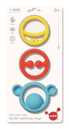 Poznaj Nigi, Nagi & Nogi! To zestaw 3 designerskich gryzaków, które ukoją ból dziąseł w okresie ząbkowania. Wykonane w 100% z silikonu spożywczego bezpiecznego dla najmłodszych. Pierścienie są łatwe do chwycenia przez małe rączki. Dzięki niebanalnym kształtom i żywym kolorom zapewnią stymulację dotykową i wizualną. Niebieski gryzaczek posiada w środku wypustkę, którą można wciskać oraz 2 "czułki", które mogą służyć jako łyżeczki do karmienia. Nigi, Nagi & Nogi są kompatybilne ze wszystkimi zabawkami marki Moluk. Starsze dzieci mogą łączyć zabawki i odkrywać nowe kombinacje!
