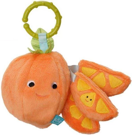Zawieszka do wózka bądź fotelika samochodowego od Manhattan Toy to radosny owoc pomarańczy, który spodoba się każdemu maluszkowi. Sympatyczna i roześmiana pomarańcza wyposażona została w zapinaną na zamek przegrodę, w której skrywają się kolejne niespodzianki. Trzy plasterki wykonane z niezwykle przyjemnego pluszu zapewniają stymulację sensoryczną, ponieważ mają teksturę grzechotki, dźwięk piszczałki oraz odgłos szelestu. Znajdująca się przy maskotce zawieszka ułatwia nam przymocowanie jej do wózka, fotelika oraz bujaczka. Dla ząbkujących maluchów zawieszka może pełnić również funkcję gryzaczka.