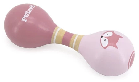 - Drewniany dwustronny marakas w kolorze różowym z sympatycznym liskiem. Marakas o długości 19 cm. Odpowiedni do zabawy i muzykowania dla niemowląt i starszych dzieci.