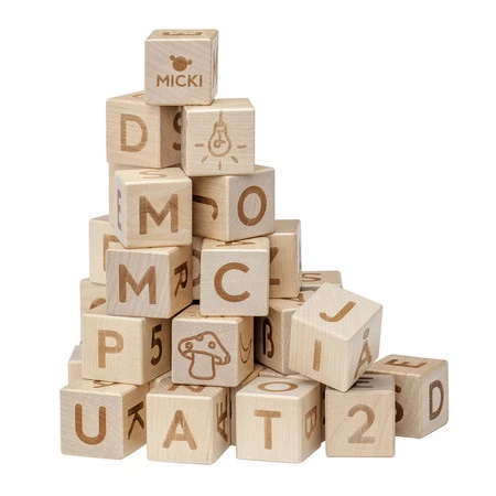 - Zabierz swoje dziecko do świata pierwszych słów i liczb przy użyciu tych klocków szwedzkiej firmy Micki z serii Premium! Drewniane klocki są w formie sześcianów, których wszystkie ścianki zostały ozdobione kolorowymi literami, cyferkami, znakami specjaln