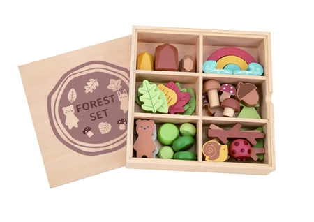 Drewniany Zestaw Leśny od Tooky Toy stworzony z myślą o zapewnieniu dzieciom niezapomnianych chwil pełnych kreatywnej zabawy. W pudełku znajdują się różnorodne elementy lasu, które umożliwiają sortowanie, układanie w stosy oraz budowanie, pozwalając na kreowanie niepowtarzalnego środowiska leśnego.