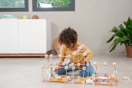 Buduj konstrukcje i geometryczne kształty łącząc drewniane elementy! Mini Trigonos to zestaw drewnianych i materiałowych elementów konstrukcyjnych: patyków, klocków i tkanin, które można łatwo ze sobą łączyć i tworzyć z nich rozmaite budowle.