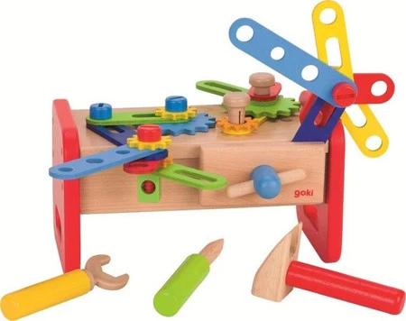 Zestaw narzędzi i komponentów do majsterkowania marki Goki w poręcznym drewnianym pojemniku. Wystarczy wyjąć zawartość i obrócić całość by uzyskać dostęp do stolika i imadła. Właśnie bogactwu funkcji zestaw zawdzięcza swoją nazwę.