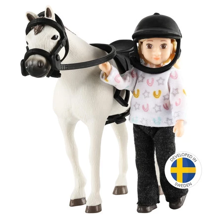 - Urocza, realistyczna lalka dżokejka w komplecie z białym koniem idealnie pasuje do domku dla lalek marki Lundby. Zaprojektowany w Szwecji zestaw zawiera uroczą lalkę, białego konia, kask jeździecki, uzdę i siodło. Lalka ma zdejmowane ubranie oraz ruchomą