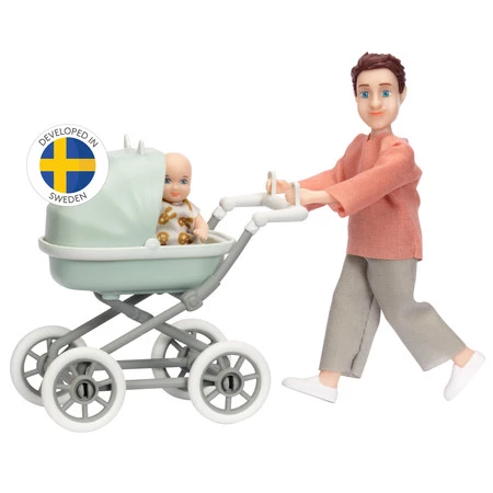 Lalka tata mężczyzna z dzieckiem i wózkiem zestaw, zabawka akcesoria Lundby