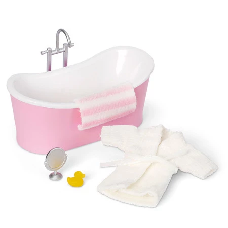 - Piękna wolnostojąca wanna z akcesoriami zaprasza do relaksującej kąpieli! Ten zestaw zawiera różową wannę z wysokim kranem, lusterko, mięciutki szlafrok, a miłośników zabawy w wodzie zachwyci dołączona żółta kaczuszka, z którą kąpiel jest zawsze ekscytuj