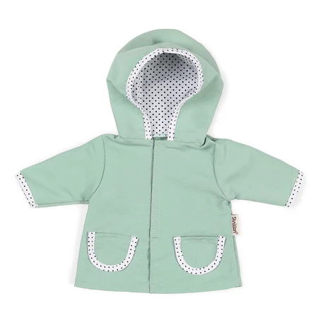 Zabierz swoją lalkę na spacer w deszczu! Dzięki tej przeciwdeszczowej kurtce Twoja mała przyjaciółka pozostanie sucha, nawet gdyby deszcz lał jak z cebra. Ubranie dla lalek wykonano z materiału o właściwościach wodoodpornych w pięknym miętowym kolorze, z białą podszewką w czarne kropki. Staranność i wysoka jakość wykonania idealnie wpisują się w styl Twojej ukochanej lalki. Wypróbuj także miętowe kalosze sprzedawane osobno, aby stworzyć idealny stój na deszczowy dzień.