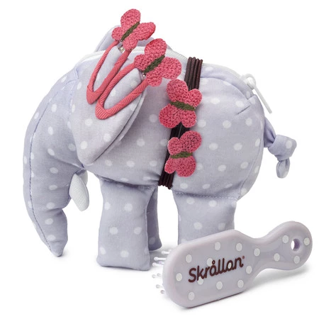 Wszystko mieści się w uroczej małej kosmetyczce w kształcie słonia o imieniu Elli. Elli uwielbia nosić ze sobą szczoteczkę, gumki i spinki do włosów Skrållan. Jest także miękki i przyjemna w dotyku, uwielbia być przytulany i bawić się!