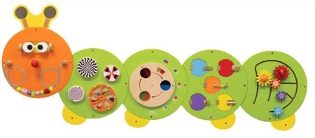 Dużą drewniana tablica motoryczna gąsienica w formie panelu ściennego jest idealna do żłobka, przedszkola, świetlicy.