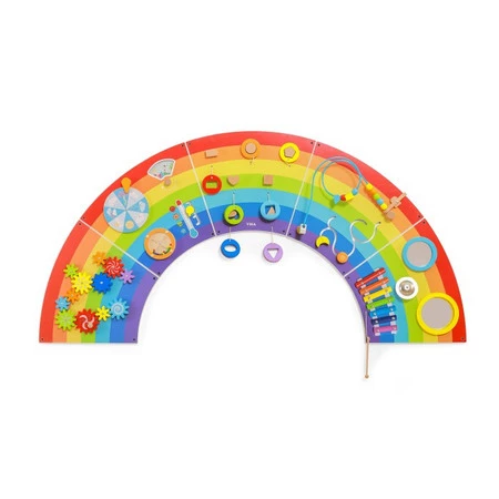 Panel wiesza się na ścianie na odpowiedniej wysokości dla dziecka co pozwala na zabawę bez końca. Co równie ważne tęcza będzie stanowiła piękną dekorację ściany i zawsze będzie na swoim miejscu. Dzięki swoim funkcjom oraz wyglądowi sprawdzi się również wszędzie tam, gdzie przychodzą dzieci: poczekalnie, przychodnie, szkoły i jednostki naukowe, zamknięte place zabaw czy kąciki dla dzieci w restauracjach - jest wiele zastosowań dla tych zabawek.