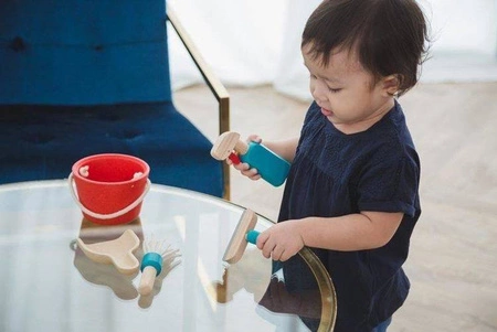 - Zestaw do sprzątania Plan Toys zawiera wiaderko, płyn ze spryskiwaczem, miotełkę, ściągaczkę i szufelkę.