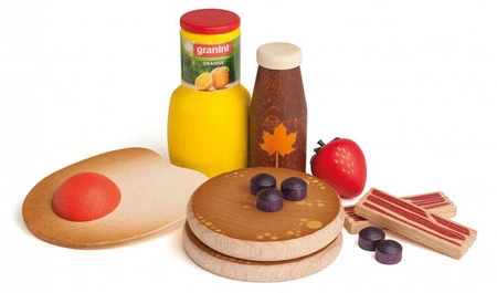 W skład zestawu wchodzą: dwa naleśniki, dwa kawałki bekonu, pięć borówek, jedna truskawka, jajko sadzone, sok pomarańczowy oraz syrop klonowy. Wszystkie elementy zostały wykonane z drewna bukowego i pomalowane bezpiecznymi farbami, co gwarantuje nie tylko trwałość i bezpieczeństwo zabawki, ale także jej niezwykle realistyczny wygląd.