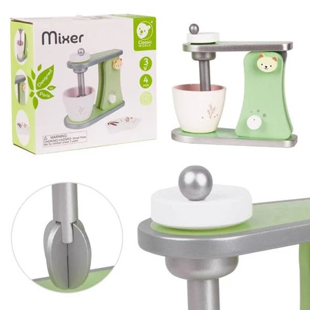Mikser od Classic World to idealna zabawka dla małej gospodyni, która kocha wypieki. Świetny również jako uzupełnienie wyposażenia kuchni. Z mikserem wszystkie małe wypieki na pewno będą udane. Dzięki specjalnemu pokrętłu pióra miksera kręcą się. Mała pani domu będzie mogła przygotowywać najróżniejsze słodkości dla swoich lalek i misiów. Produkt wykonany z najwyższej jakości drewna. Pastelowe kolory przyciągną każdego malucha i zachęcą do wspólnej zabawy.