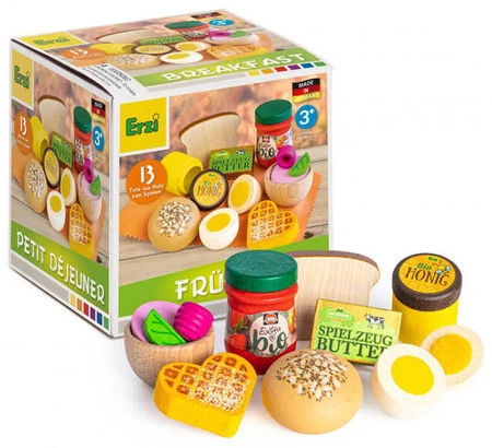 Zestaw kuchenny Erzi składa się z 13 elementów, w tym m.in. bułki, kromki chleba, gofra, masła, dżemu, miodu, jajek do krojenia, filiżanki herbaty, maliny i listka mięty. Dzięki temu Twoje dziecko będzie mogło przygotować różnorodne posiłki, rozwijając przy tym swoją wyobraźnię i zdolności manualne.