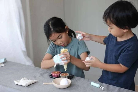 Ukręć krem, napełnij rękaw cukierniczy i wypełnij upieczone babeczki. Następnie udekoruj bitą śmietaną i podawaj swoim gościom! Zestaw do pieczenia babeczek to idealne uzupełnienie drewnianej kuchni. Wraz z mikserem, piekarnikiem oraz zastawą tworzy wspaniałe zaplecze do zabawy w dom, cukiernię czy restaurację. Zestaw zawiera dwie foremki do babeczek, dwie babeczki, 2 czapki z bitej śmietany, worek z mąką, miskę, trzepaczkę, rękaw cukierniczy, tacę oraz rękawicę kuchenną i łopatkę.