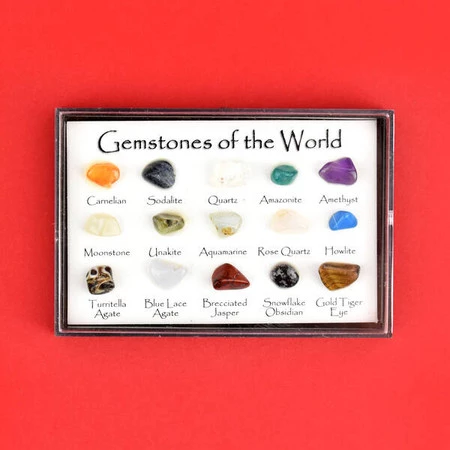 Zestaw dla młodego naukowca i odkrywcy. W gablotce (10 cm) znajduje się 15 kamieni z opisem nazwy. Super zestaw dla młodego kolekcjonera.