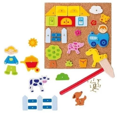 - Zestaw do tworzenia historii o wiejskim życiu. Za pomocą młotka należy przybijać je do korkowej planszy, a powstaną obrazki, jakie tylko podpowie wyobraźnia.
