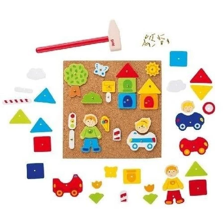 Przybijanka Goki "Chłopczyk i dziewczynka w mieście" to zabawka kreatywna. Dzieci tworzą obrazki z drewnianych elementów przybijanych do korka.